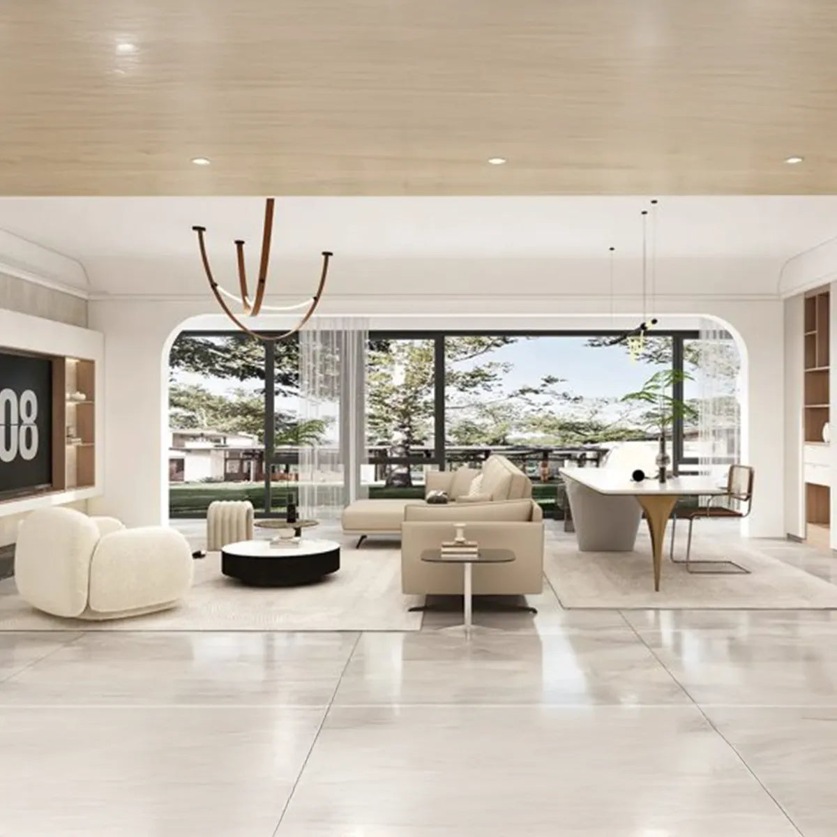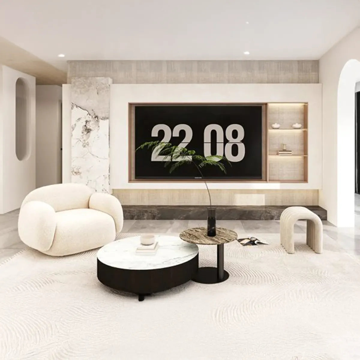 At the heart of this modern apartment is a living room and a home office designed to offer not only high-level aesthetics, but also supreme functionality. Each carpentry element is masterfully integrated, creating an elegant and unified environment. The home office space is a true invitation to productivity, while the living room remains the ideal place for moments of relaxation and socialization. Here, the combination of pure white and warm wood tones creates a welcoming environment, ideal for an active and dynamic lifestyle.