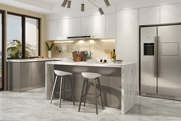 Cu fronturi meticulos frezate din MDF vopsit și finisate cu lacuri acrilice premium, aceasta bucătărie este nu doar o priveliște pentru ochi, ci și o investiție pe termen lung. Structura sa este realizată din PAL robust, completată de cant ABS și dotată cu feronerie de top de la BLUM.