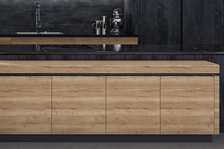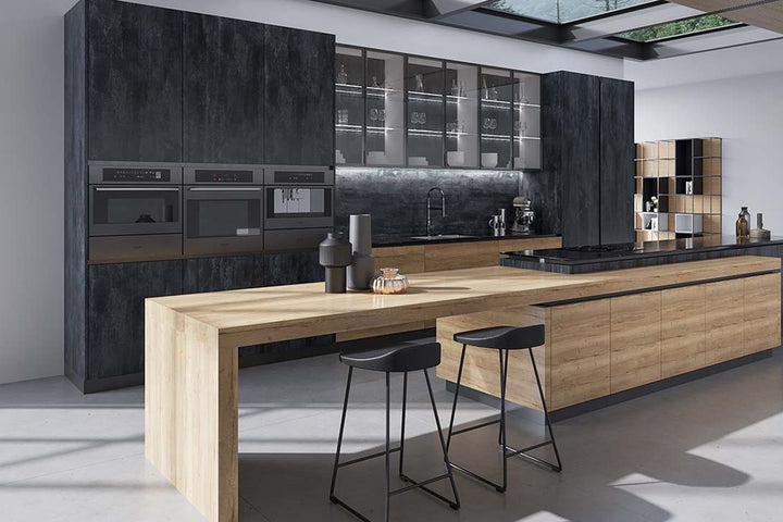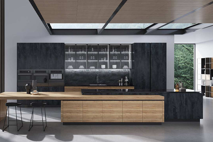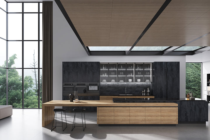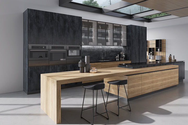Dulapurile din lemn de stejar, cu un finisaj natural, adaugă o notă de căldură și autenticitate, evocând farmecul bucătăriilor tradiționale italiene. Contrastul creat de panourile din piatră neagră aduce un element modern și sofisticat, completând designul elegant al bucătăriei. Insula centrală este spațioasă și multifuncțională, oferind atât spațiu pentru gătit, cât și un colț perfect pentru mese informale, dotat cu scaune elegante.