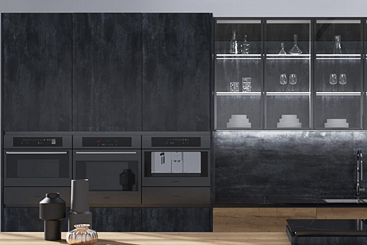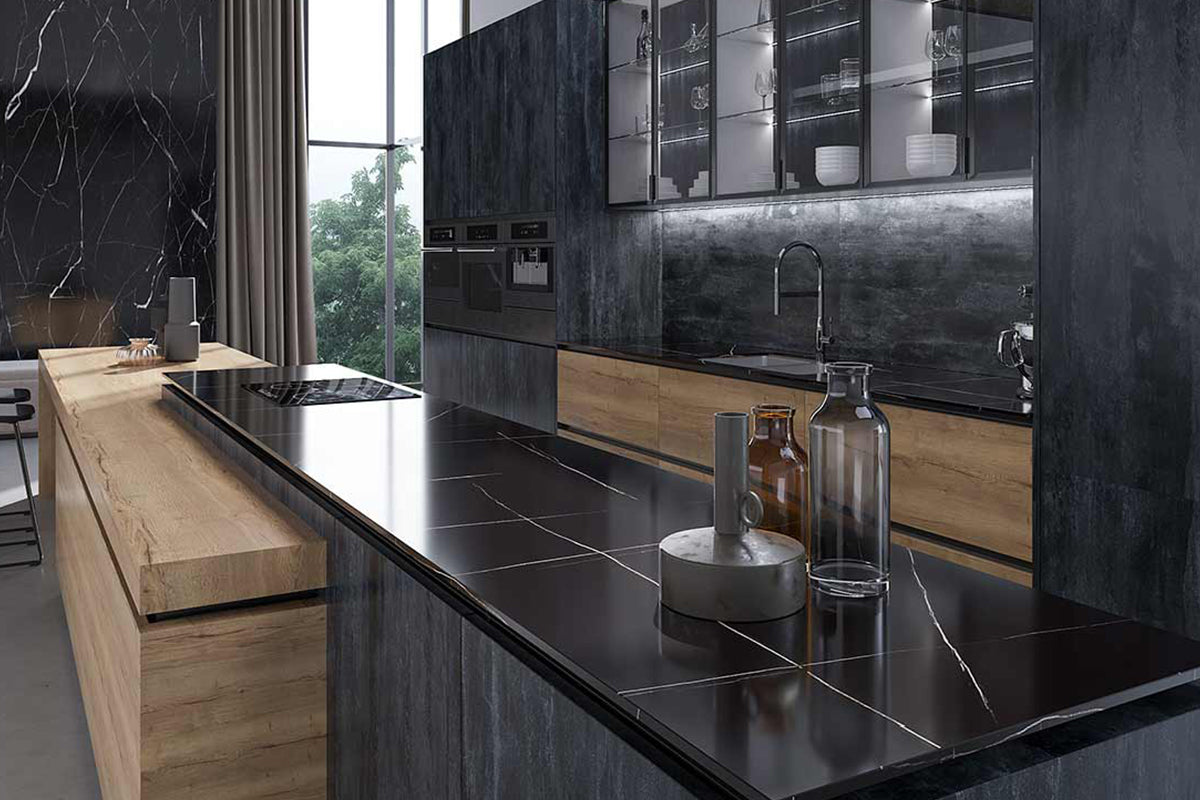 Blaturile din piatră neagră sunt nu doar estetice, dar și extrem de practice, oferind o suprafață durabilă pentru toate activitățile culinare. Rafturile deschise și dulapurile cu uși de sticlă permit expunerea elegantă a veselei și ustensilelor, adăugând un element decorativ care reflectă personalitatea și gustul proprietarilor.