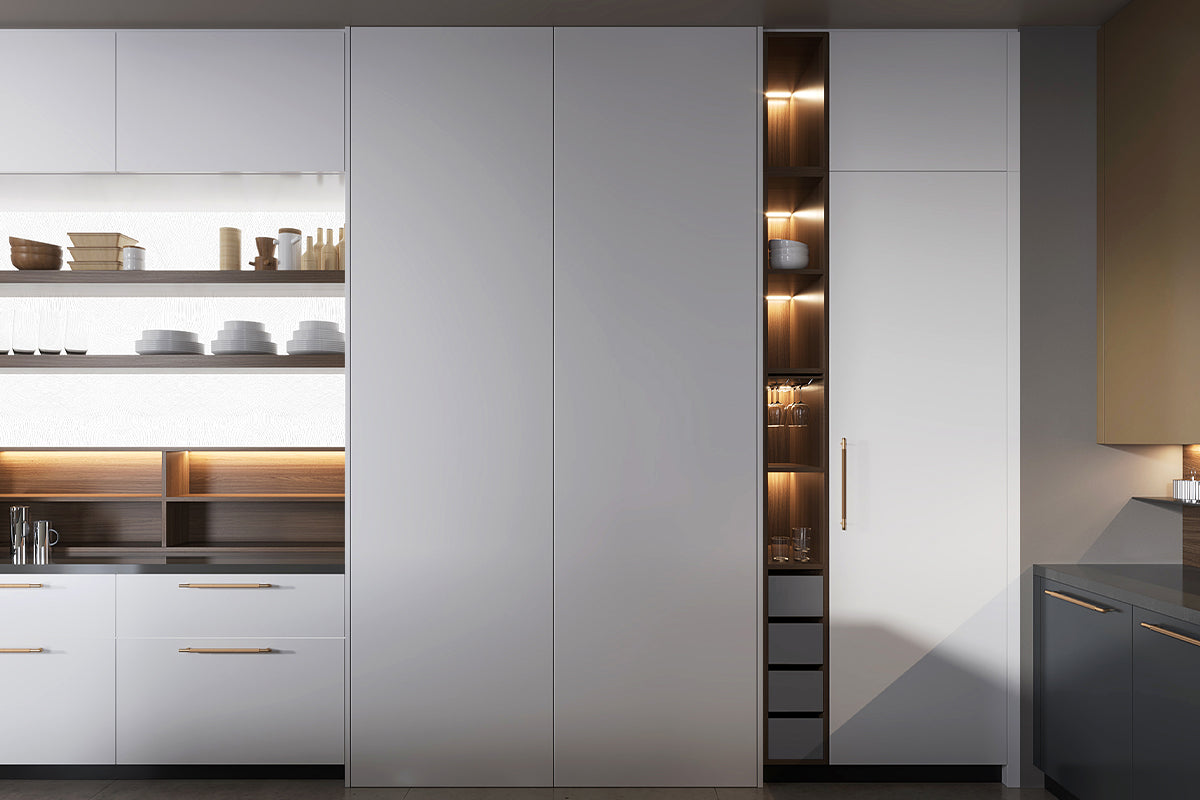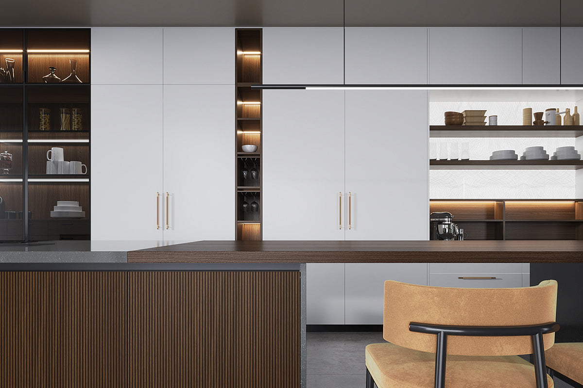Dulapurile superioare, într-o nuanță modernă de gri deschis, completează armonios paleta de culori a bucătăriei. Rafturile deschise, integrate în design, sunt iluminate discret pentru a evidenția obiectele decorative și ustensilele de bucătărie, oferind în același timp un spațiu de depozitare accesibil și elegant.