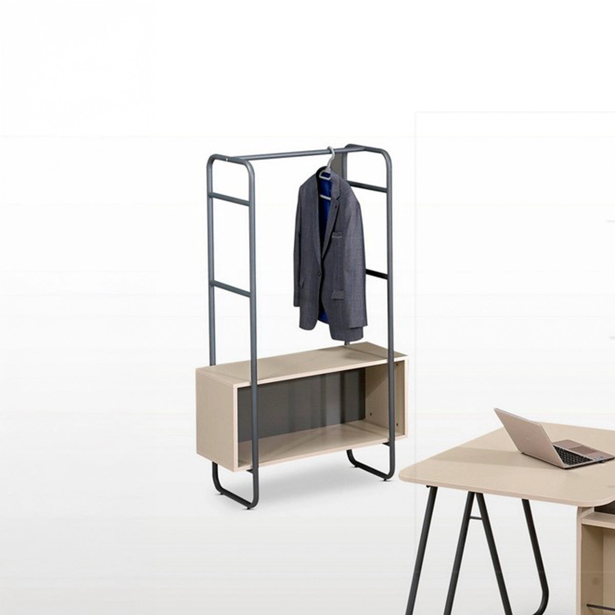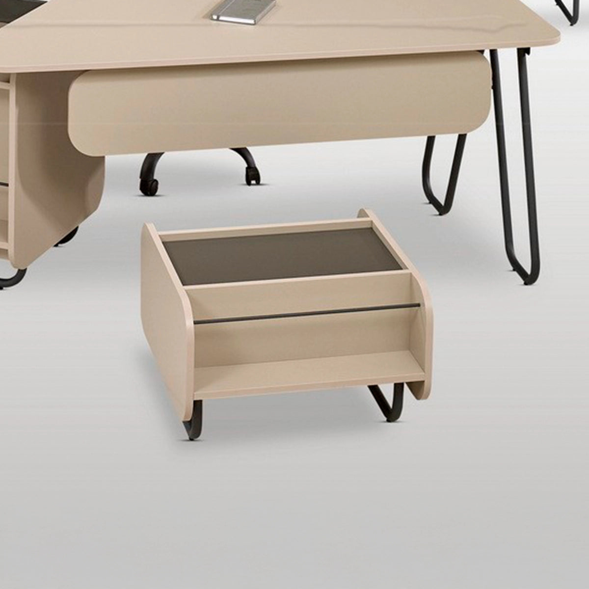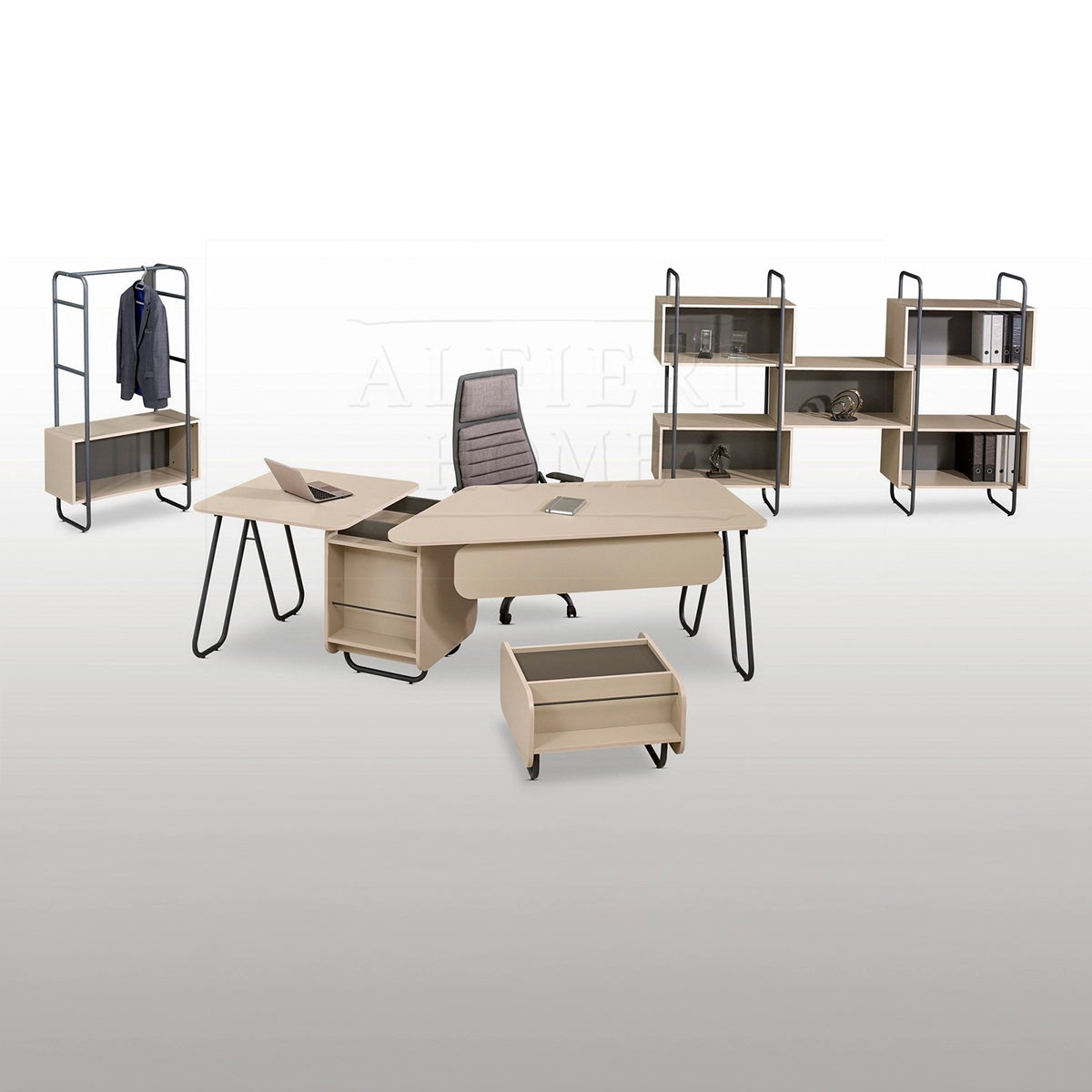 The ZAFFIRO set combines utility with elegance, offering a complete solution for modern executive spaces. The 18 mm thick desk, with metal legs and a silent sliding system, is designed for comfort and efficiency. The coffee table and the two cabinets — one single and one double — harmoniously complete the space. With a coat rack in the same material and finish, this set brings a touch of style and functionality to any office.