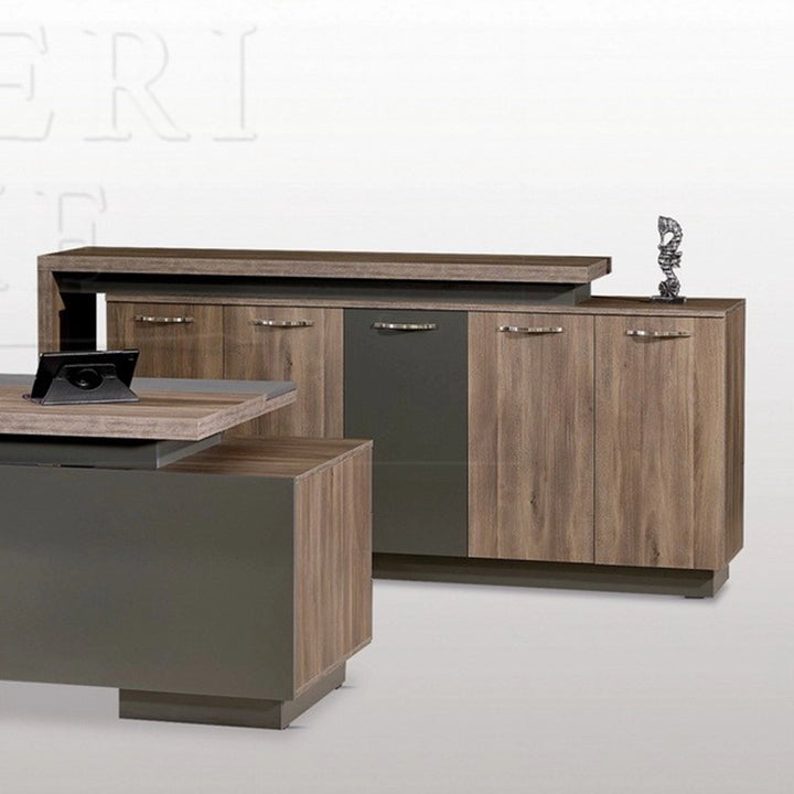 Il SET SCRIVANIA VIRELLO coniuga eleganza classica e funzionalità moderna, rendendolo ideale per prestigiosi uffici direzionali. La scrivania direzionale con spessore di 48 mm e superficie in pelle offre una sensazione di lusso e comfort, completata dal sistema di scorrimento a chiusura fluida. Il suo design sofisticato conferisce autorevolezza e professionalità a qualsiasi spazio di lavoro.