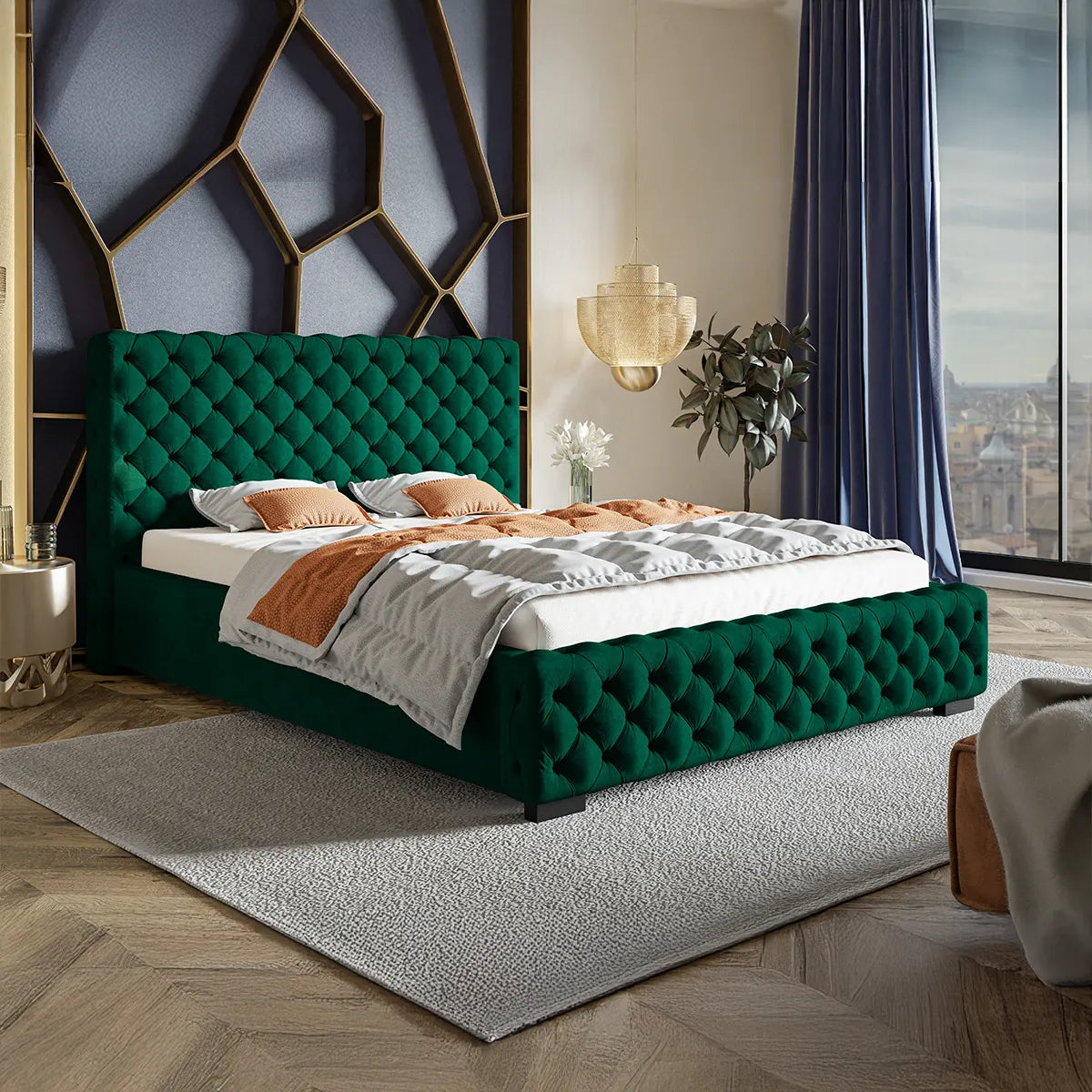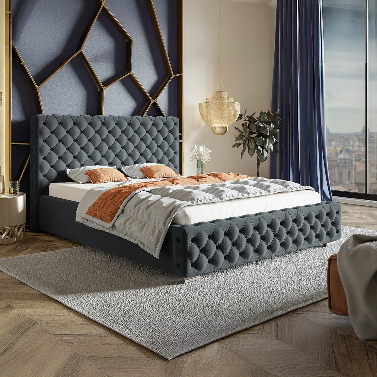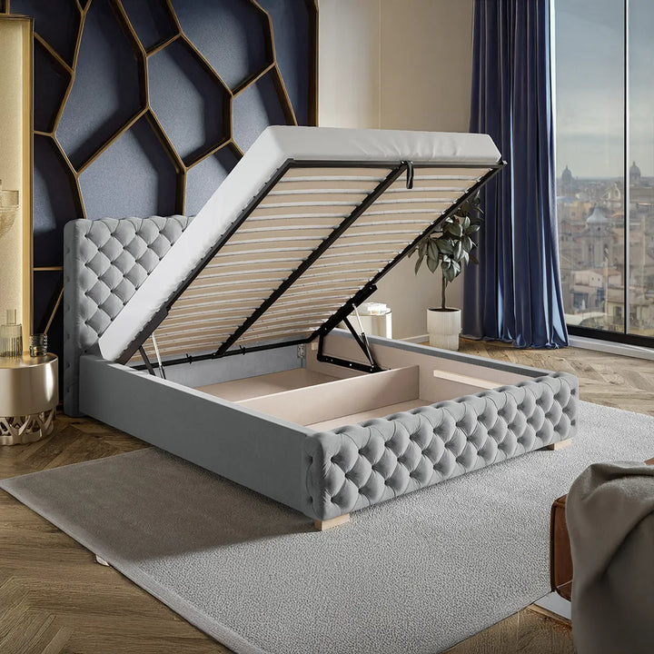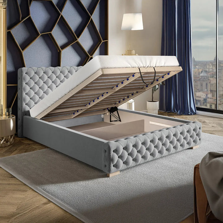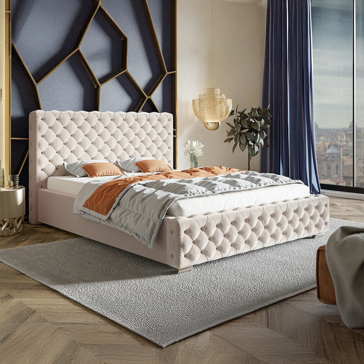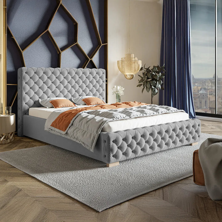 Structura sa robustă, realizată din materiale de înaltă calitate, cum ar fi lemnul masiv sau metalul, asigură stabilitate și durabilitate, în timp ce tapițeria fină, disponibilă într-o gamă variată de texturi, cum ar fi catifeaua sau pielea ecologică, adaugă o notă de rafinament subtil. Tăblia impunătoare și detaliile atent lucrate conferă patului o prezență vizuală deosebită, potrivită atât pentru un decor modern, cât și pentru unul clasic.